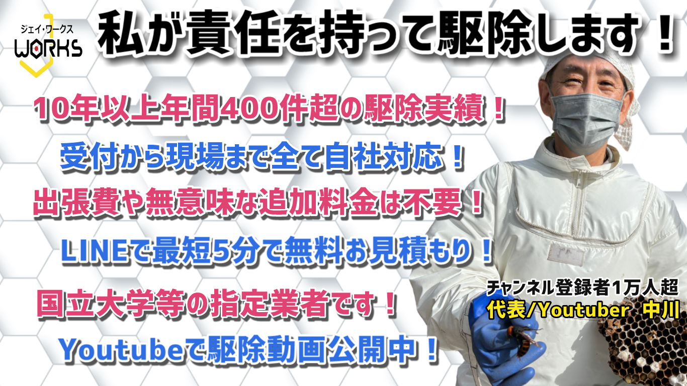 そこで選択肢の一つとして弊社滋賀のハチ駆除「ジェイ・ワークス」の概要をご説明したいと思います。